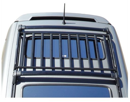 Encaixado nos trilhos originais do veículo e preso entre as travessas já existentes no teto;
